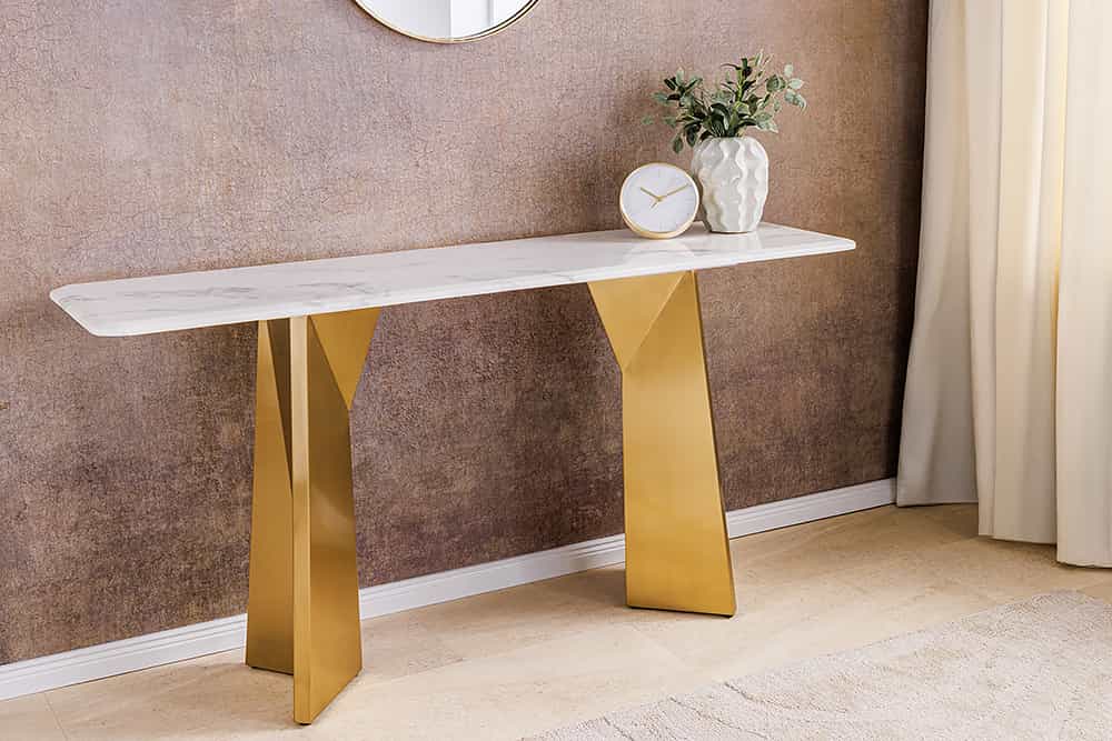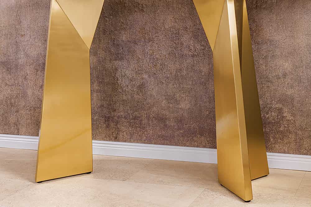 Deze exclusieve wandtafel combineert elegant design met tijdloze schoonheid. Het ranke witmarmeren tafelblad geeft het een luxe uitstraling, terwijl het geborstelde frame in champagnegoud voor een stijlvol geheel zorgt. Dankzij de harmonieuze combinatie van hoogwaardige materialen en modern design zal deze tafel een échte blikvanger zijn in uw woonruimte.