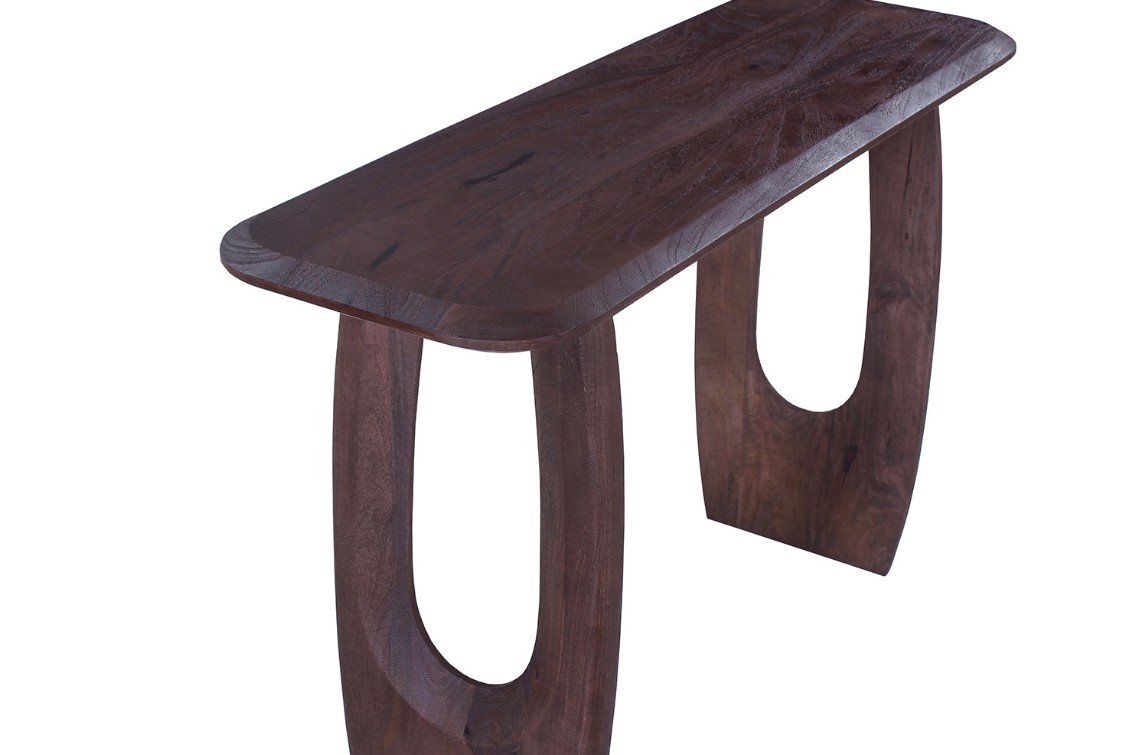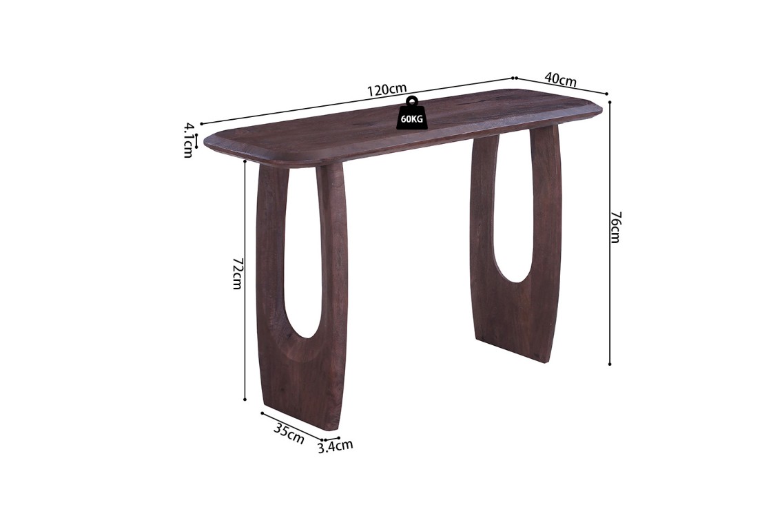 Moderne ruimtelijke sidetable met openingen in de poten. Deze sidetable is volledig gemaakt van massief mangohout en heeft een Deens ovaal ontwerp met afgeronde lijnen.