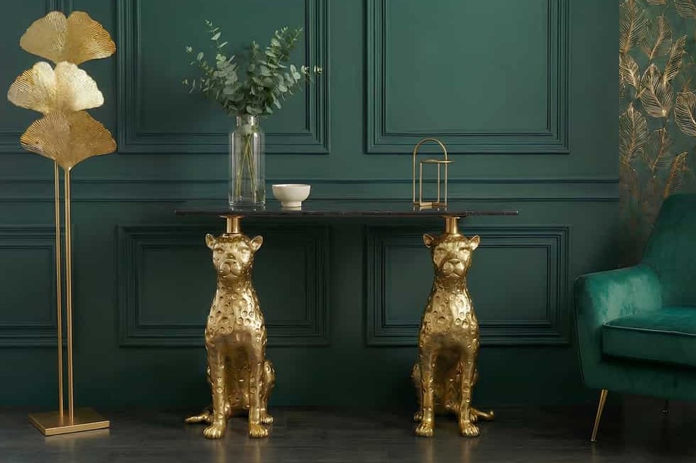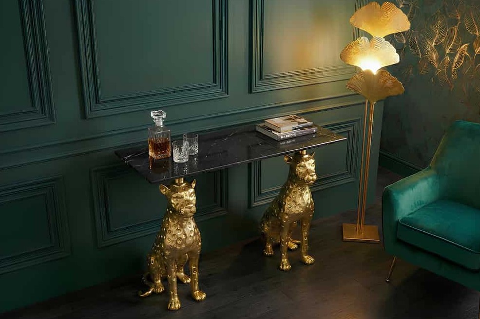 Extravagant designobject met een luxueuze uitstraling! Sidetable of wandtafel met tafelblad van massief marmer voorzien van panther figuren als onderstel. Deze sidetable is een uitzonderlijk meubelstuk dat kunst en functie op indrukwekkende wijze combineert. Twee rijk gedetailleerde panterfiguren in een gouden uiterlijk ondersteunen het elegante marmeren blad en geven de consoletafel een krachtige, maar elegante uitstraling. Het handgemaakte ontwerp maakt ieder meubelstuk een individuele blikvanger met een exclusief karakter.