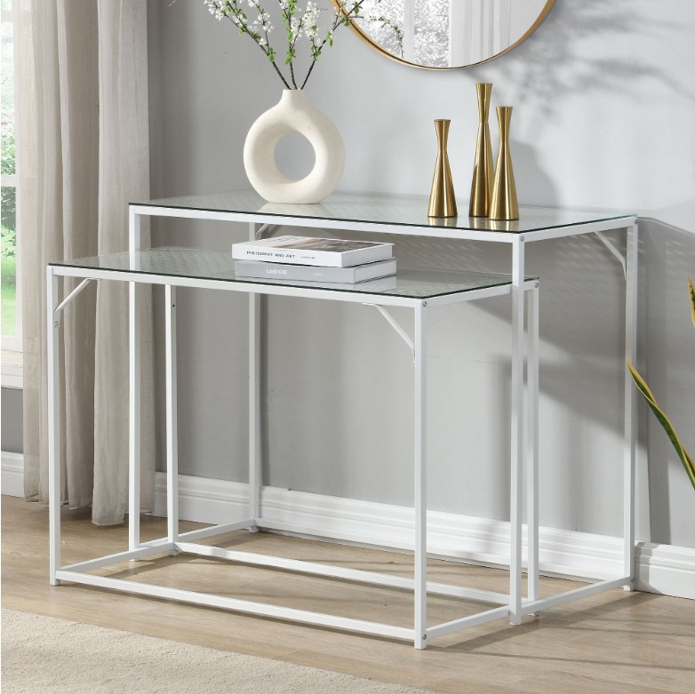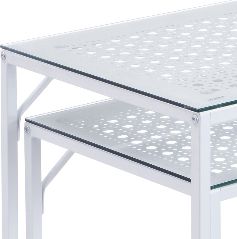Moderne decoratieve sidetable set van metaal. Tafelbladen in trendy afwerking gecombineerd met transparant tafelblad van veiligheidsglas.