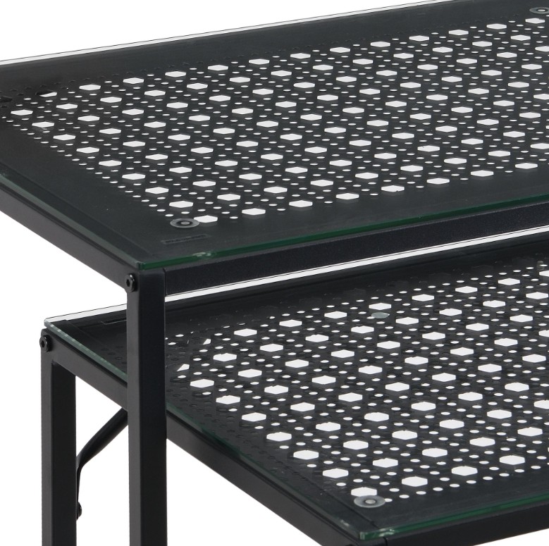 Moderne decoratieve sidetable set van metaal. Tafelbladen in trendy afwerking gecombineerd met transparant tafelblad van veiligheidsglas.