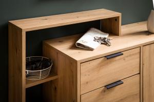 Moderne schoenenkast met metalen accenten en ombouw en fronten in eiken decor kleur. Aan de binnenzijde zijn er dubbele opbergvakken voor schoenen Deze ladenkast is verkrijgbaar in de afmeting bxdxh: 56 x 30 x 129 cm Kleurcombinatie: eiken / zwart