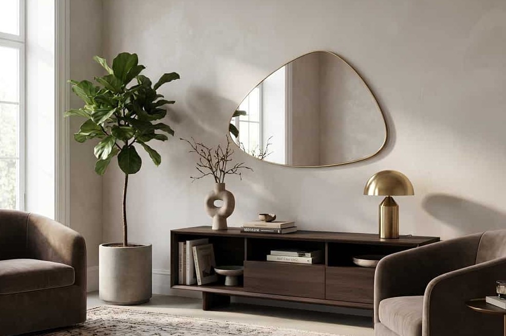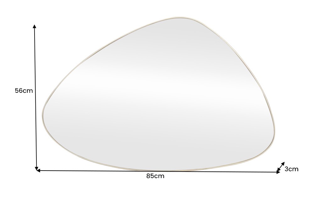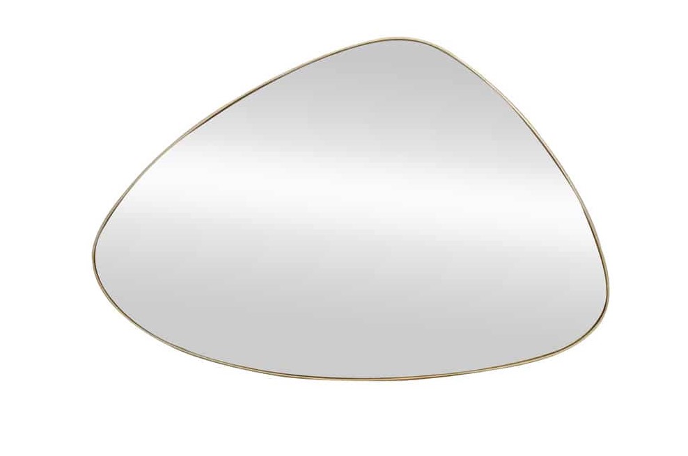 Moderne organisch vormgegeven wandspiegel met metalen goudkleurige omlijsting. De spiegel is verticaal en horizontaal op te hangen.