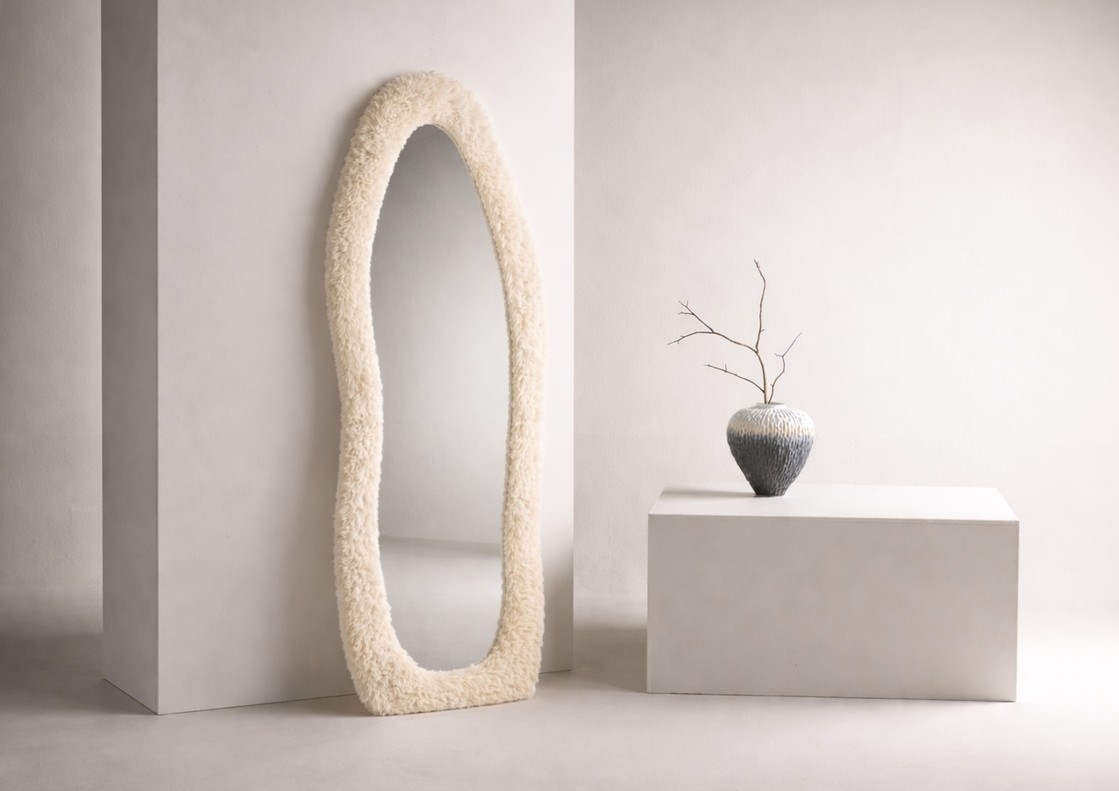 Trendy organische spiegel die echt opvalt! Het zachte beige frame van nepbont zorgt voor een speelse en moderne uitstraling die warmte en karakter aan de kamer toevoegt. De organische vorm geeft een harmonieuze indruk, waardoor de spiegel zowel uitnodigend als zacht aanvoelt. Perfect voor de slaapkamer, gang of als trendy accent in de woonkamer – Deze spiegel tilt elke ruimte naar een hoger niveau!