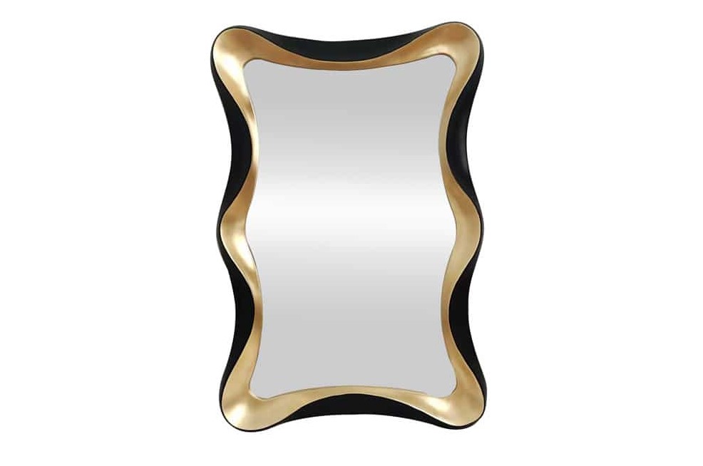 Bijzondere stijlvolle eyecatcher wandspiegel vormgegeven door een goudkleurige binnenrand rondom het spiegelglas en zwart accent aan de buitenzijde. De spiegel heeft een metalen ophanging die zowel verticaal als horizontaal te gebruiken is.