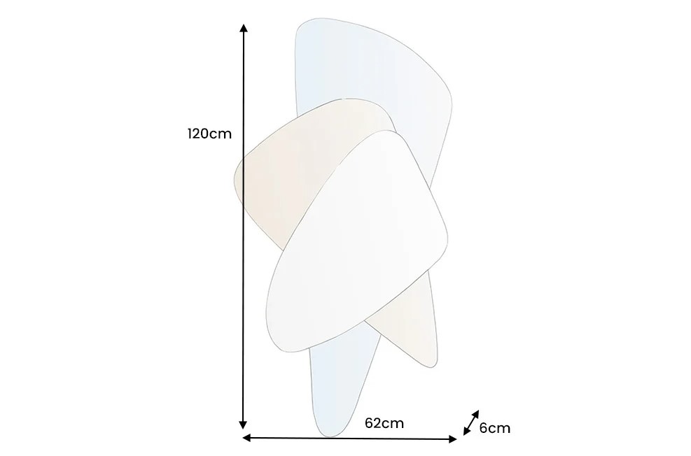 Designobject en functionele spiegel tegelijk! Deze geometrische wandspiegel overtuigt met een buitengewone compositie van overlappende, organisch-geometrische spiegeloppervlakken. De combinatie van blauw getinte, bruin getinte en helder spiegelglas geeft het ontwerp een moderne lichtheid en maakt de spiegel een artistieke blikvanger op elke muur. Met een hoogte van 120 cm maakt het een sterke, decoratieve uitstraling.