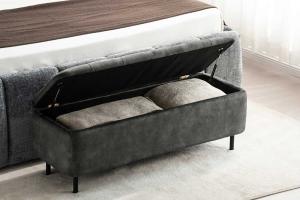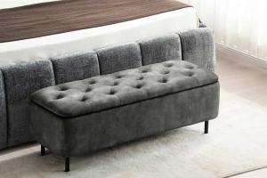 Opbergbank van fluweel in chesterfield look met knopen. Afmetingen ca: Breedte 140 cm Diepte 40cm Hoogte 40 cm Kleur: antiek grijs Materialen: Bekleding van fluwelen stof 100% polyester