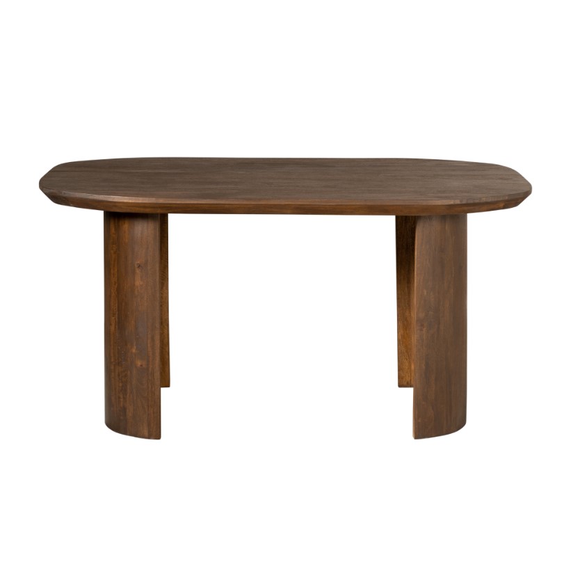 Modern bureau van mangohout in warme bruine kleur gecombineerd met rond vormgegeven massief houten kolom onderstellen.