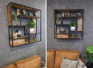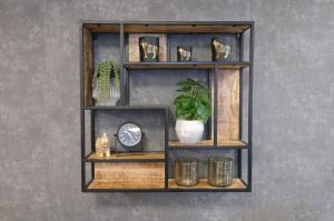 Modern wandrek van metaal voorzien van schappen van massief mangohout. Dit wandrek is verkrijgbaar in de afmeting bxdxh: 100 x 100 x 16 cm Kleurcombinatie: Naturel bruin mangohout / zwart Materialen: Schappen van massief mangohout Frame van metaal poedercoat