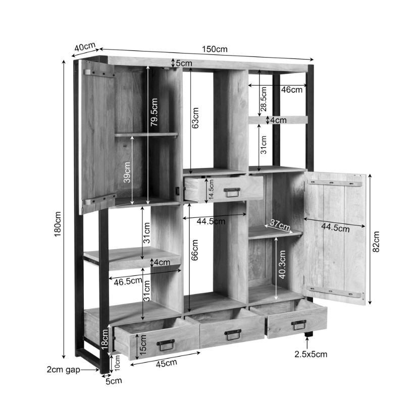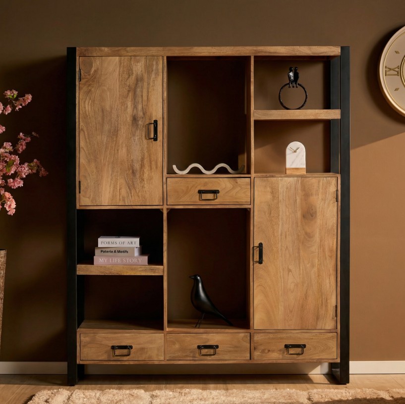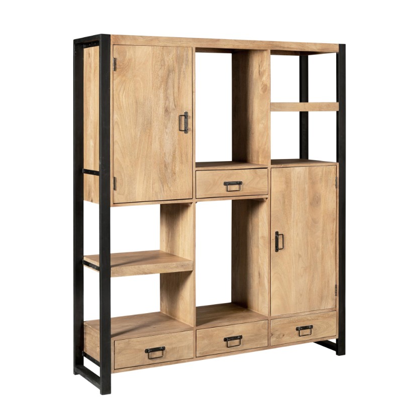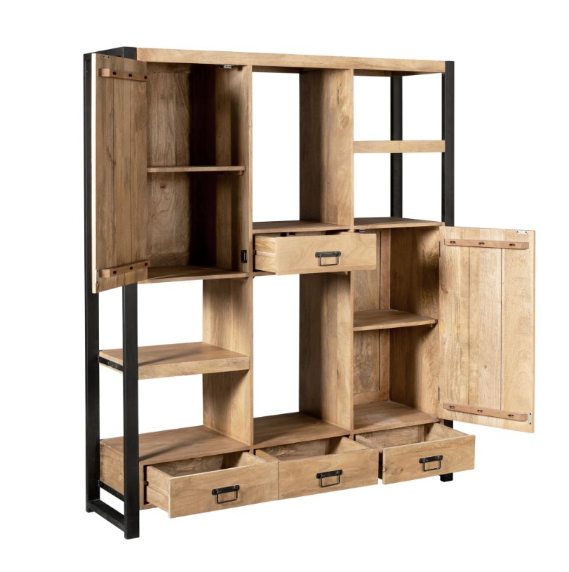 De kast is gemaakt van naturel bruin mangohout gecombineerd met zwart metalen frames en zwarte handgrepen van gelakt metaal.