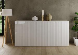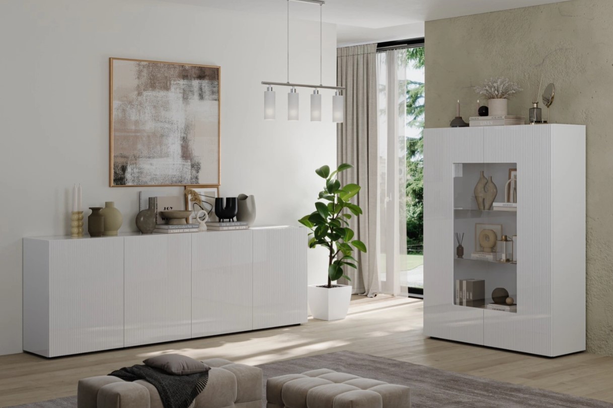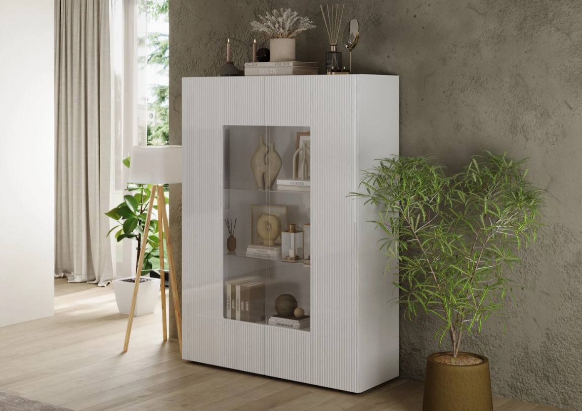 Deze vitrinekast is een moderne en stijlvolle toevoeging in de woonomgeving. Achter de twee deuren met helder doorzichtig glas is er voldoende opbergruimte. De deurfronten zijn voorzien van een ribbel design. Combineer deze vitrinekast met de overige meubelen uit dit woonprogramma om een mooi interieur te creëren.