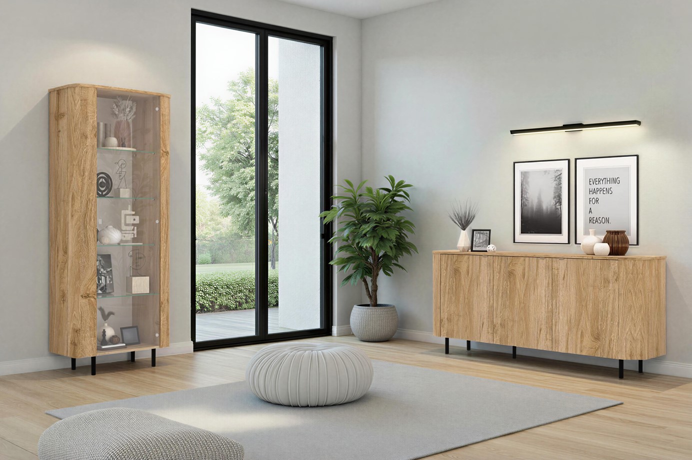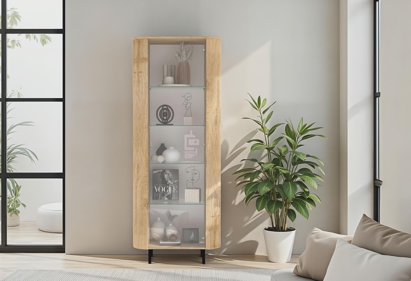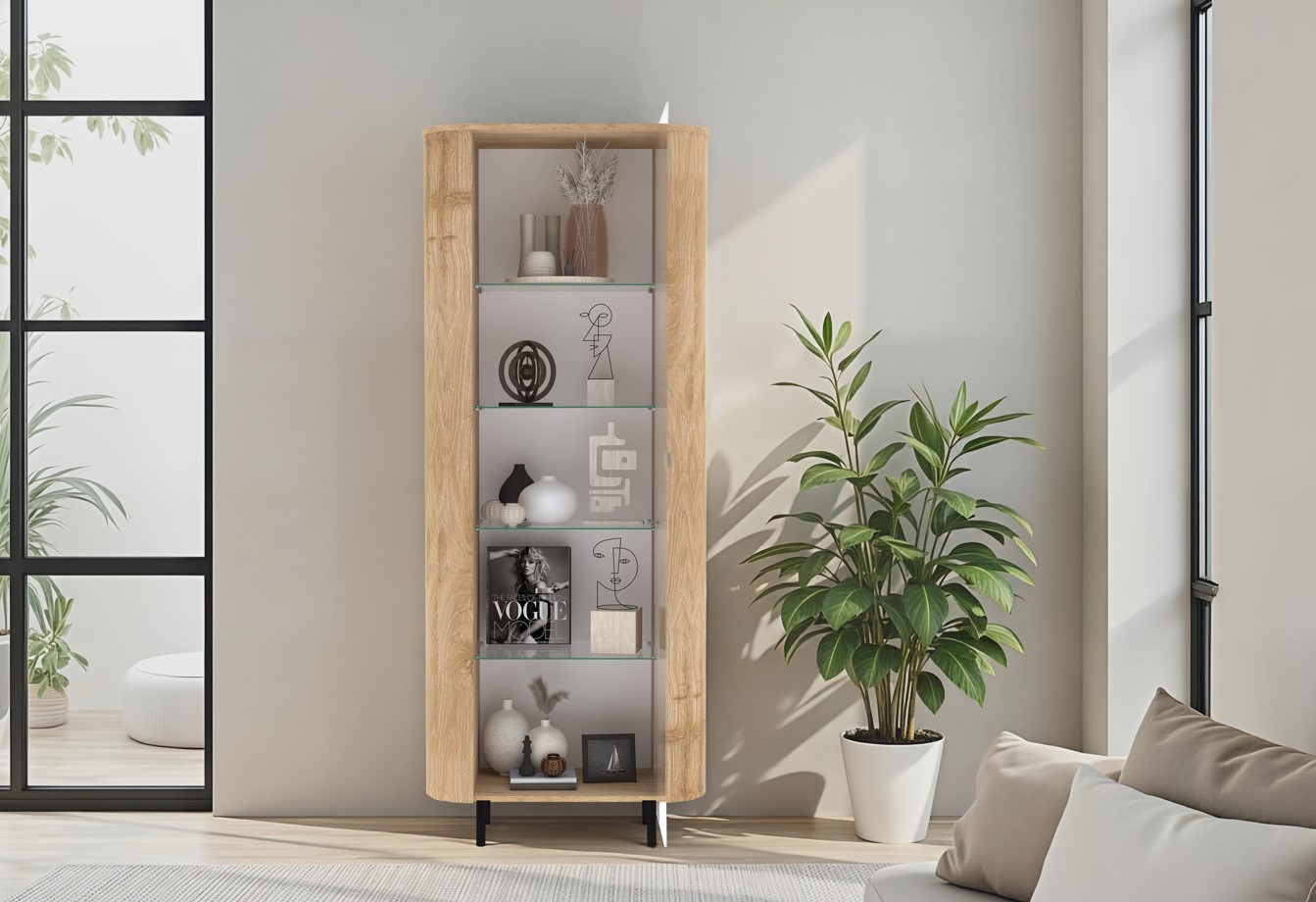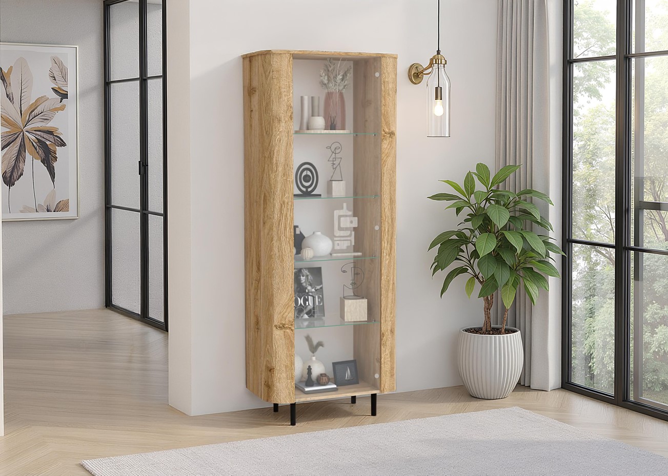 Moderne vitrinekast in de kleur eiken cadiz met één deur van transparant veiligheidsglas. De kast wordt stevig ondersteunt door moderne zwart metalen poten. Een aanwinst in moderne woonruimtes. De harmonieus gebogen elementen en afgeronde voorzijden zorgen voor een stijlvolle, mooie uitstraling.