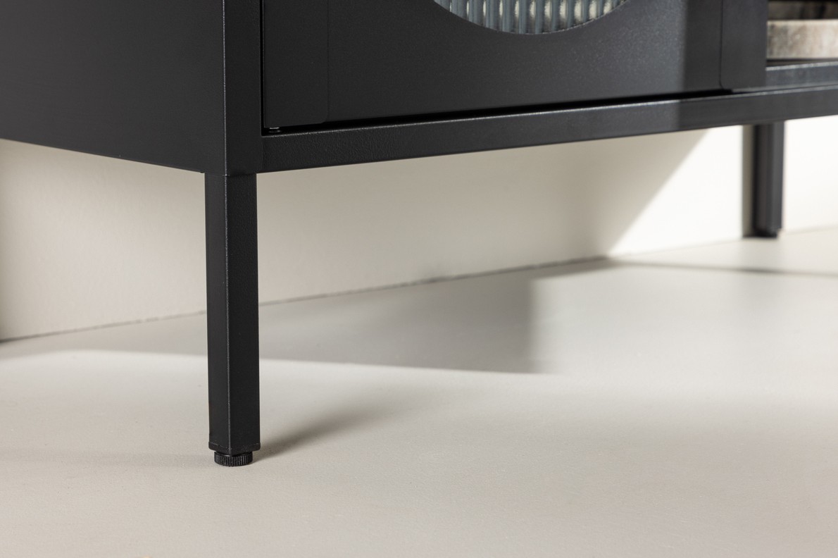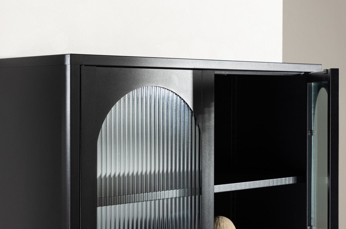Moderne stevige en functionele vitrinekast van metaal gecombineerd met glas. Met deze vitrinekast krijg je een praktisch en stijlvol meubelstuk dat perfect is voor moderne woonomgevingen. Of de kast in de woonkamer, keuken of slaapkamer staat, het zal een praktisch en visueel aantrekkelijk meubelstuk in uw huis zijn. De kast heeft vier royale schappen, die voldoende ruimte bieden voor het opbergen van persoonlijke spullen. De twee deuren zijn gemaakt van golvend glas, wat een interessante visuele dimensie en een vleugje elengantie aan het meubilair geeft.