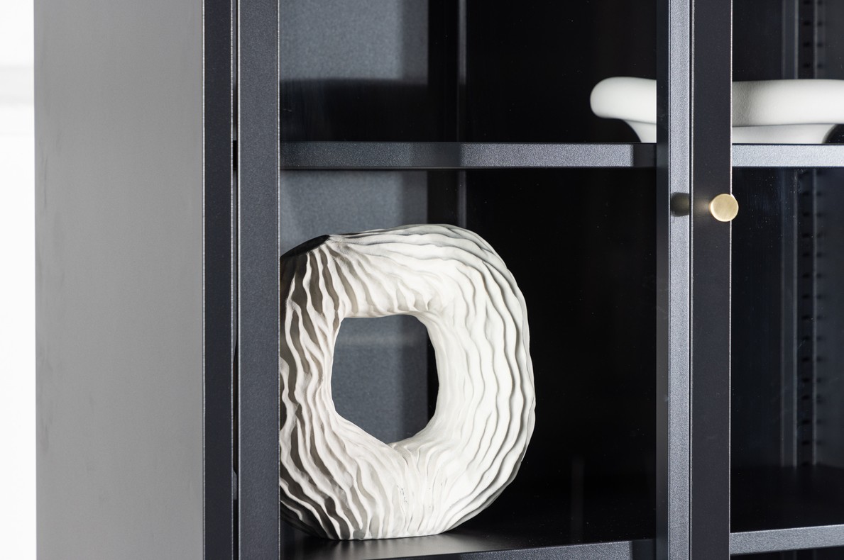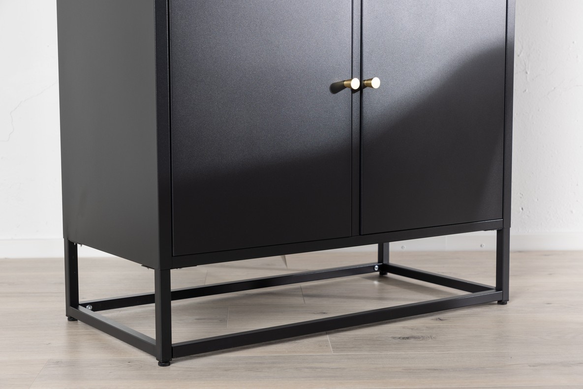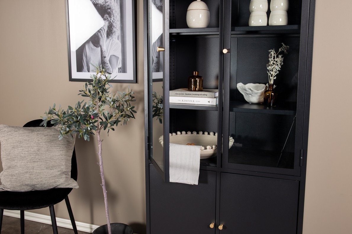 Moderne stevige en functionele vitrinekast met vier deuren van metaal waarvan twee deuren met glas. Met deze vitrinekast krijg je een praktisch en stijlvol meubelstuk dat perfect is voor moderne woonomgevingen. Of de kast in de woonkamer, keuken of slaapkamer staat, het zal een praktisch en visueel aantrekkelijk meubelstuk in uw huis zijn. De kast heeft vier royale schappen achter de glasdeuren, die voldoende ruimte bieden voor het opbergen van mooie objecten of persoonlijke spullen.