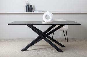 Moderne rechthoekige eettafel met een luxueus karakter en trendy details in het ontwerp. Het tafelblad in zwarte kleur is gemaakt van MDF-fineer. De tafel heeft een strak moderne uitstraling met gekruiste metalen zwarte poten, wat zorgt voor een eyecatcher effect. Het tafelblad heeft schuin aflopende tafelranden en een mooie gladde afwerking waardoor de tafel een mooie uitstraling krijgt. Deze tafel is leverbaar in de afmeting lxbxh: 180 x 90 x 76 cm Overige informatie: Dikte tafelblad 2,5 cm Kleurcombinatie: Tafelb...