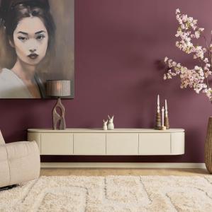 Modern groot zwevend TV wandmeubel met vijf klepdeuren die voorzien zijn van hoogwaardig 'push-to-open' sluitsysteem. Dit meubel is verkrijgbaar in de afmeting bxdxh: 280 x 35 x 30 cm Verkrijgbaar in de kleur: naturel bruin Materialen: massief mangohout gelakt