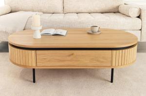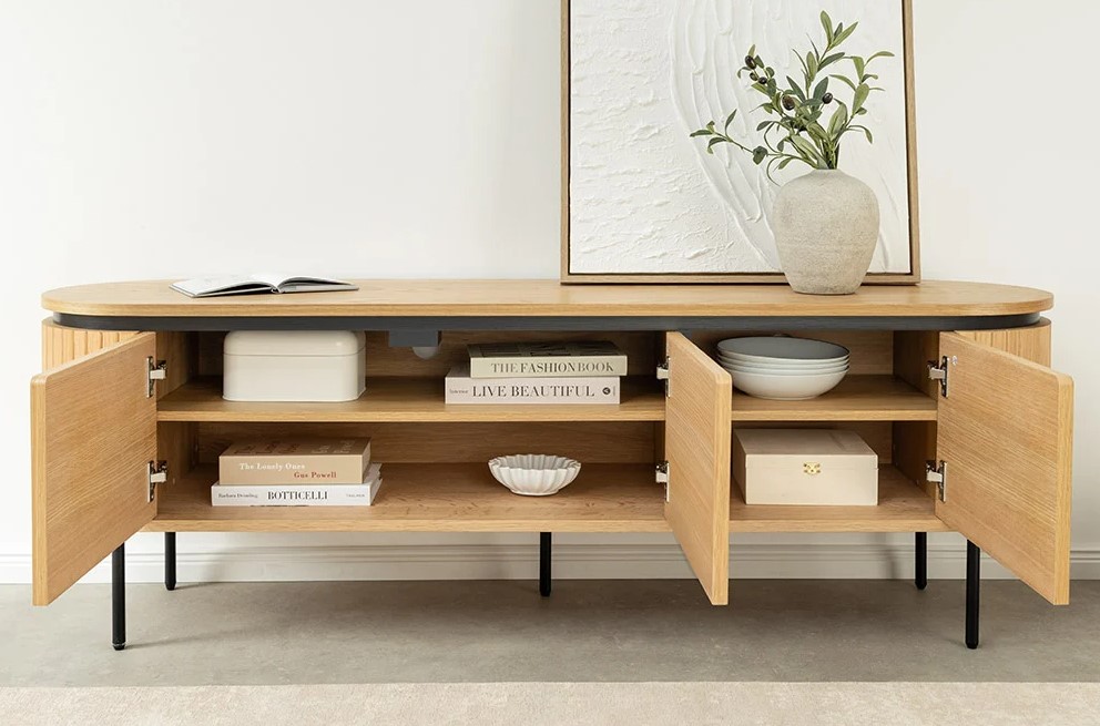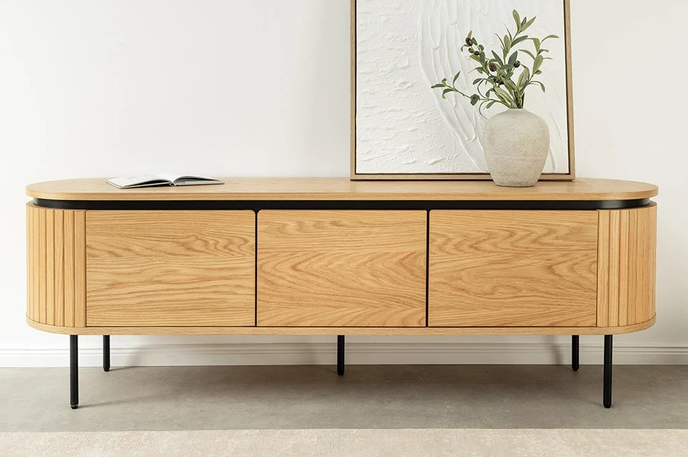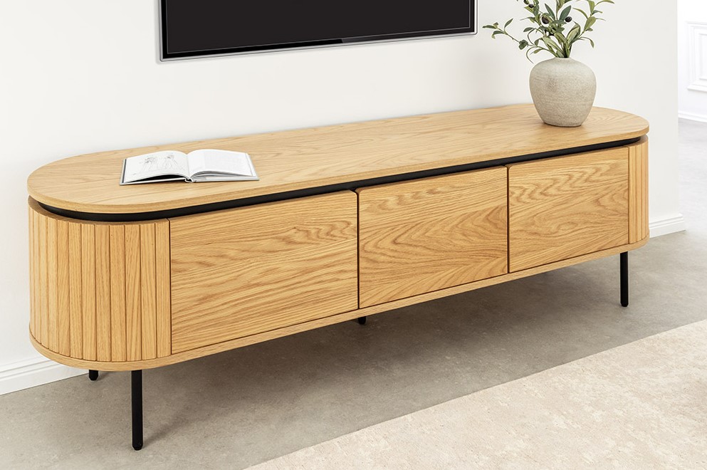 Modern TV-meubel met ovale vormgeving en rondingen met lattenpatroon. Het meubel is voorzien van drie deuren en wordt gecombineerd met zwart metalen pootjes.