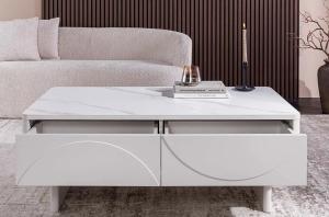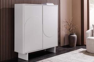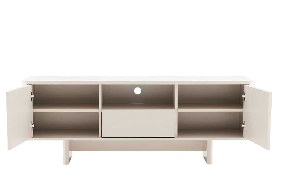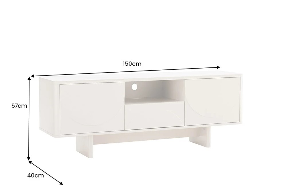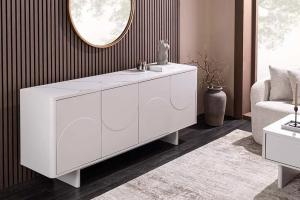 Modern TV-meubel gemaakt van hoogwaardige materialen. Schoonheid en functie in perfecte balans! De kastombouw en fronten in elegant wit inspireren met zacht gebogen, halfronde reliëfs die een spannend spel van licht en schaduw creëren. Het boven paneel gemaakt van keramiek in marmerwit, geeft het geheel een stijlvolle uitstraling en brengt een vleugje luxe in uw huis.