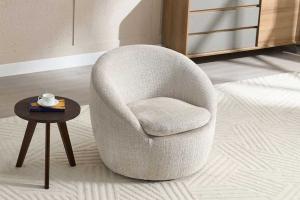 Retrodesign fauteuil met mooie ronde vormgeving. 360 graden draaibaar uitgevoerd in taupe bouclé stof. Een zachte, geweven stof met een oppervlakte van geweven lusjes. De fraaie ronde organische vormgeving in combinatie met het fijne zachte zitcomfort, geven deze fauteuil een luxe karakter. Verkrijgbaar in de ca afmeting bxdxh: 76 x 75 x 76 cm Kleur: taupe Materialen: Bekleding van textiel stof bouclé