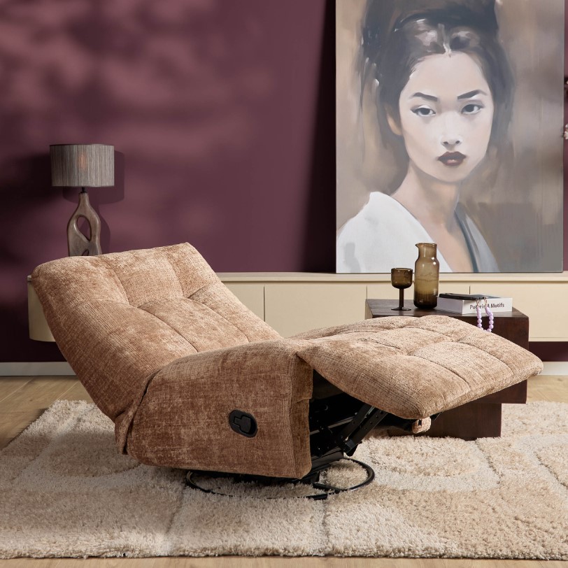 Deze relaxfauteuil combineert comfort met gebruiksgemak. Met de zwarte hendel kantelt de rugleuning eenvoudig naar achteren en komt het voetgedeelte omhoog. De stoel is draaibaar en beschikt over een lichte schommelstand voor extra ontspanning. De stiknaden in blokmotief op de rugleuning en zitting geven het ontwerp een moderne en strakke uitstraling.