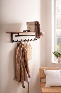 Tijdloze kapstok in industriële woonstijl. Deze wandkapstok met 8 haken, hoedeplank en kledingstang zorgt voor een complete kapstok die voldoende ruimte biedt voor jassen, tassen, sjaals etc. Afmeting bxdxh: 100 x 20 x 30 cm Kenmerken: hoedeplank kledingstang 8 haken Kleurcombinatie: Hoedeplank: naturel bruin acaciahout Frame & kledingstang zwart Materialen: Hoedeplank van 1,5 cm dik massief acaciahout Frame & roede van metaal poedercoating