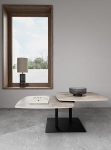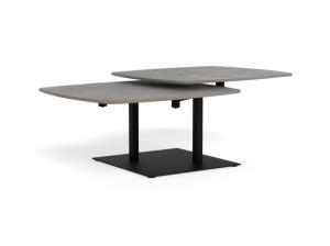 Moderne dynamische draaibare salontafel die de aandacht trekt met zijn design uitstraling en functionaliteit. Met het roterende systeem kunnen de twee vierkante tafelbladen, afgewerkt in een grijs gepolijst keramisch oppervlak, in verschillende posities worden geplaatst. Het zwarte vierkante stalen frame zorgt voor stabiliteit. Afmetingen van de tafels LxBxH: 122 x 70 x 40 cm Kleurcombinatie: Tafelbladen grijs met kleurnuances Onderstel zwart Materialen: Tafelbladen van massief keramiek Onderstel van metaal poedercoat...