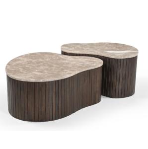 Modern vormgegeven salontafel set die is gemaakt van mangohout in de kleur donkerbruin gecombineerd met tafelbladen van massief marmer. De salontafels hebben een organische vorm met onderstel met verticaal lattenpatroon van massief mangohout waarop de tafelbladen worden geplaatst. De combinatie van het donkere hout en het lichte marmer geeft de tafel een warme en luxe uitstraling. Deze salontafel set wordt geleverd in de afmetingen L x B x H: tafel groot 84 x 73 x 34 cm tafel medium 70 x 50 x 38 cm Materialen: tafelbl...