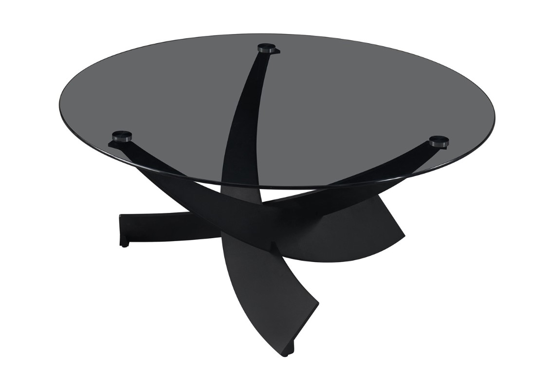 Moderne salontafel met tafelblad van grijs glas van veiligheidsglas gecombineerd met zwart design onderstel.