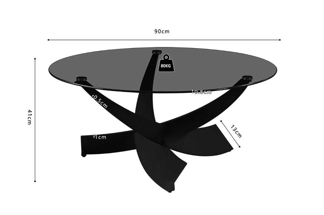 Deze salontafel rond glas wordt geleverd in de afmeting B x D x H: