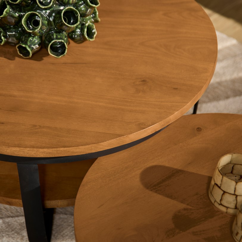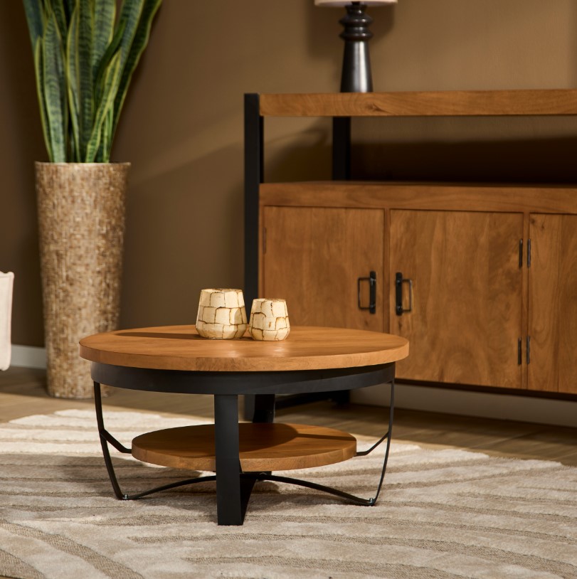 Ronde salontafel van mangohout gecombineerd met metalen onderstel.