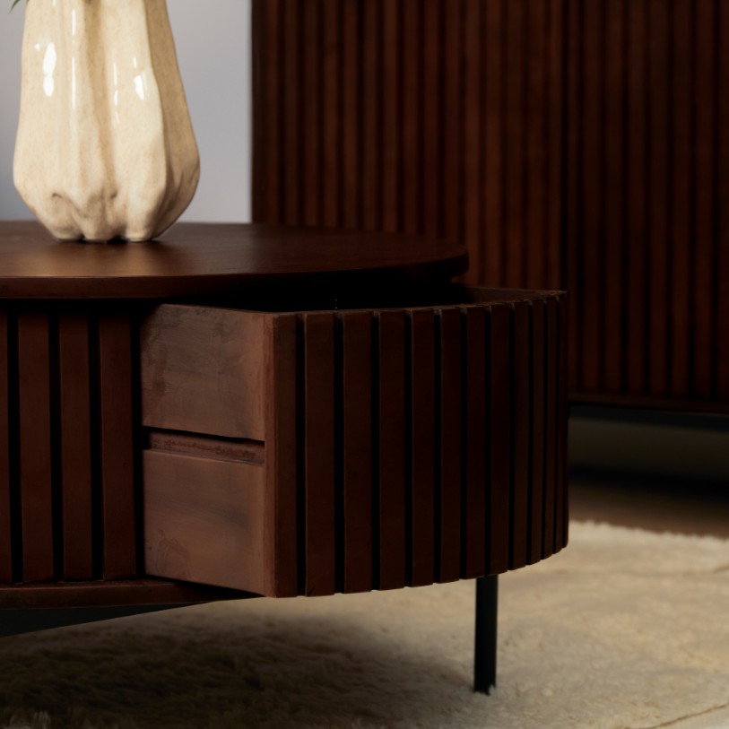Moderne ronde salontafel van massief mangohout voorzien van laden en gecombineerd met zwarte metalen poten.