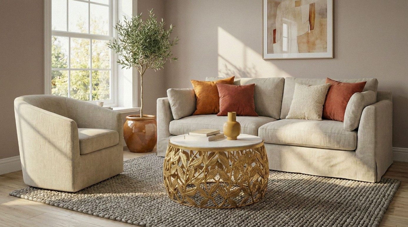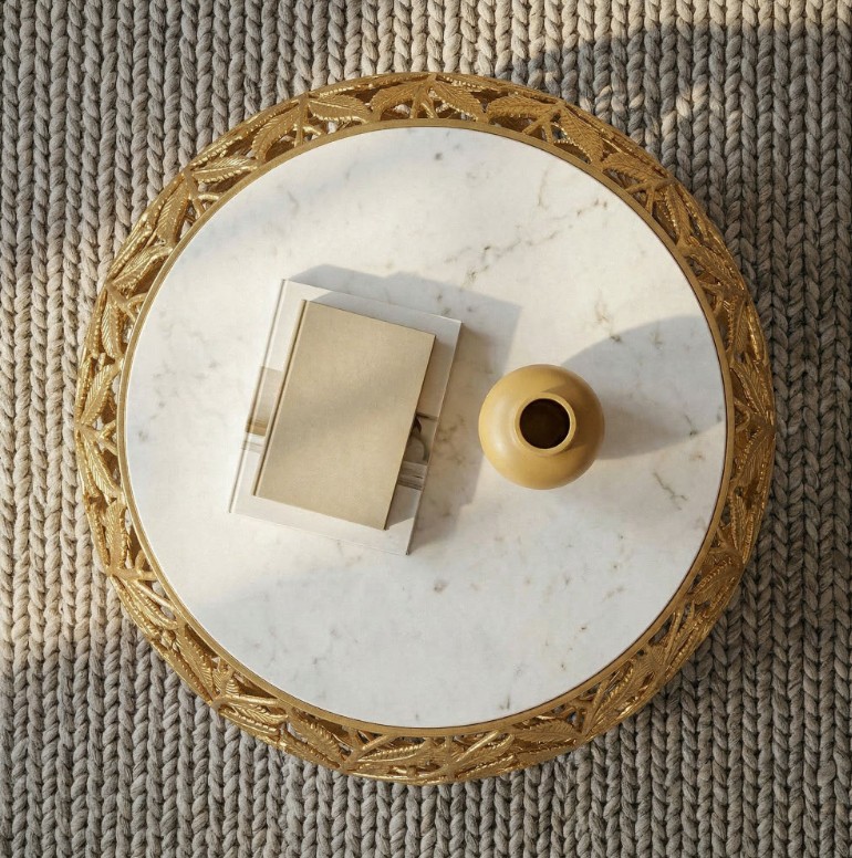 Ronde salontafel met elegante materiaal combinatie van goudkleurig onderstel met bladstructuur gecombineerd met wit tafelblad van massief marmer.