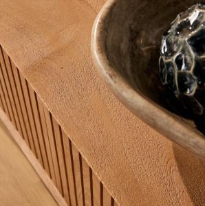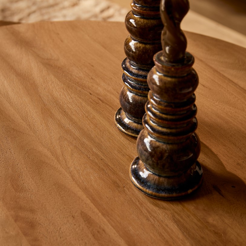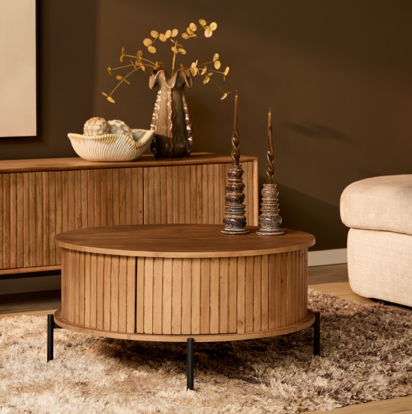 Moderne rond vormgegeven salontafel van massief mangohout. De tafel is voorzien van twee laden en wordt gecombineerd met een metalen onderstel in de kleur zwart. Rondom is de tafel voorzien van een modern verticaal lattenpatroon.