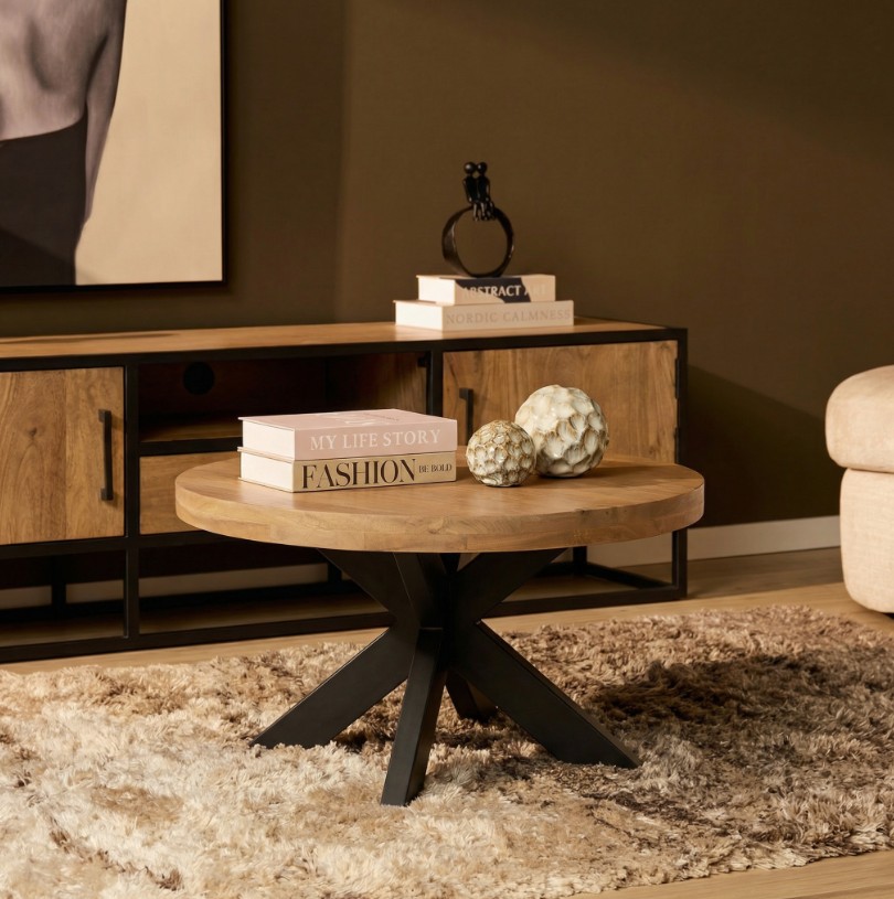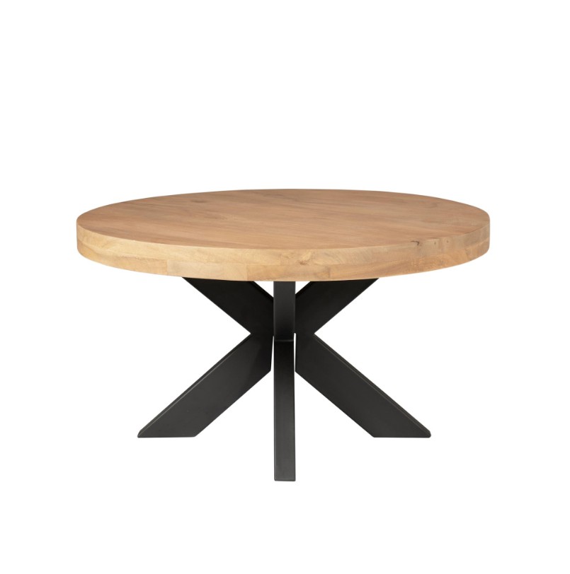 Moderne stoere ronde salontafel met glad afgewerkt tafelblad van mangohout gecombineerd met zwart metalen kruispoot onderstel.  Het ronde tafelblad van mangohout zorgt voor een warme en natuurlijke uitstraling. Het stevige metalen onderstel geeft de tafel een industriële look. Perfect voor een eigentijdse woonruimte!