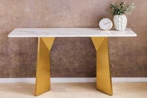 Trendy ronde salontafel met goudkleurig frame en tafelblad van veiligheidsglas in wit marmerlook.