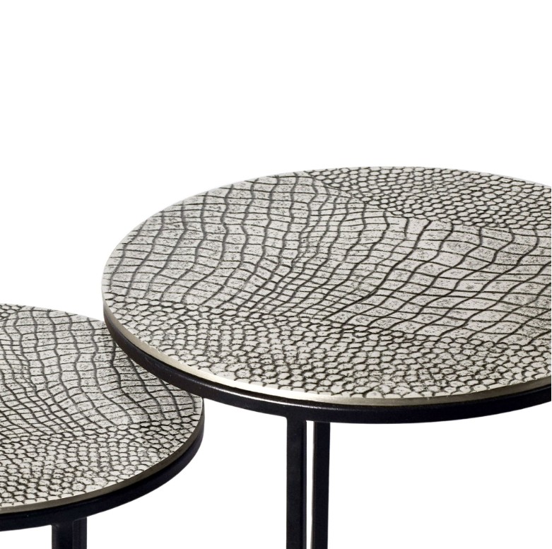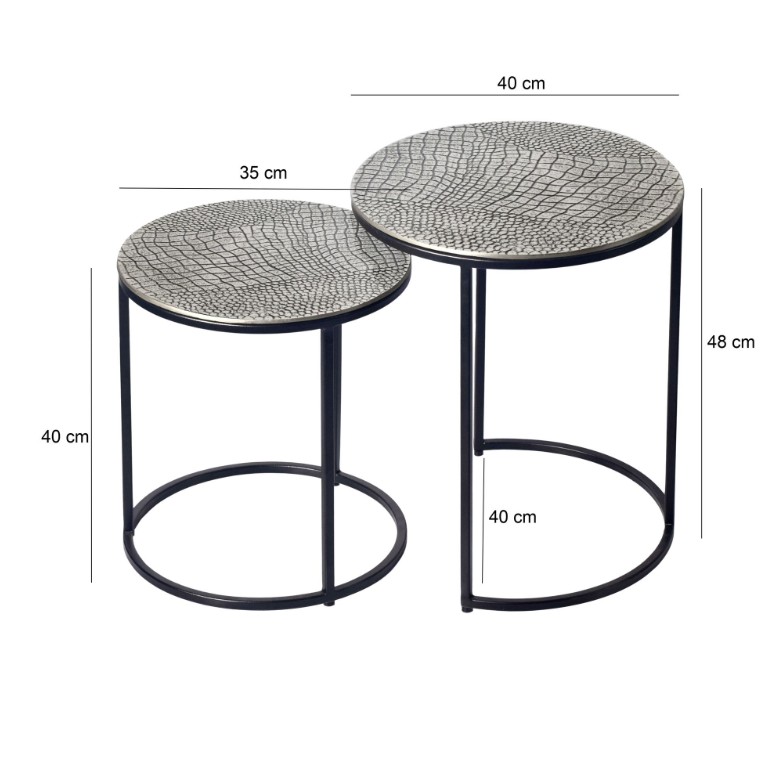 Sfeervolle zilverkleurige ronde salontafel set met tafelbladen van gelakt aluminium gecombineerd met zwarte metalen onderstellen. De tafels kunnen handig over elkaar heen geschoven worden.