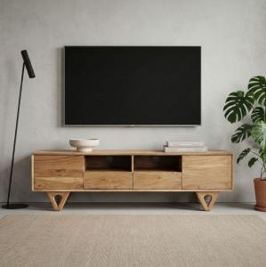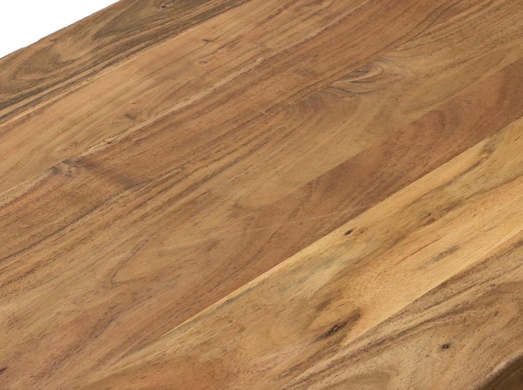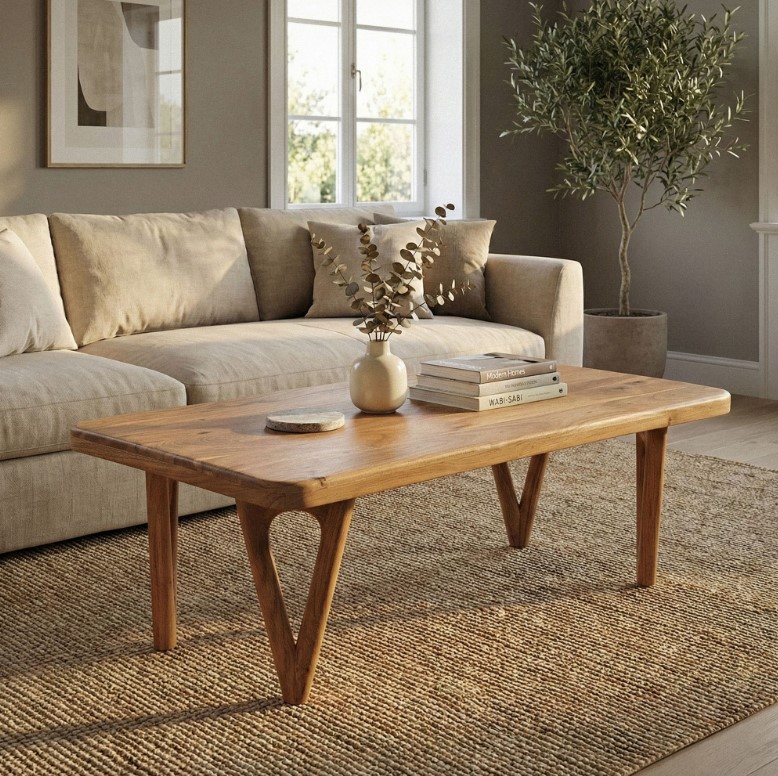 Stijlvolle salontafel met afgeronde hoeken en mooi vormgegeven massief houten V-vorm tafelpoten. Het tafelblad is 2,5 cm dik en heeft een gladde afwerking met natuurlijke houtpatronen.