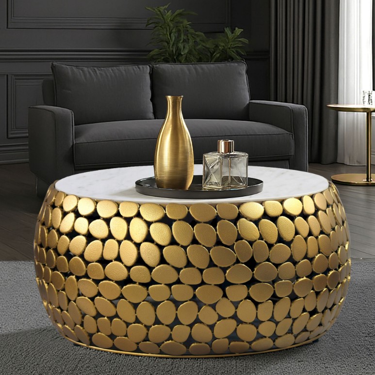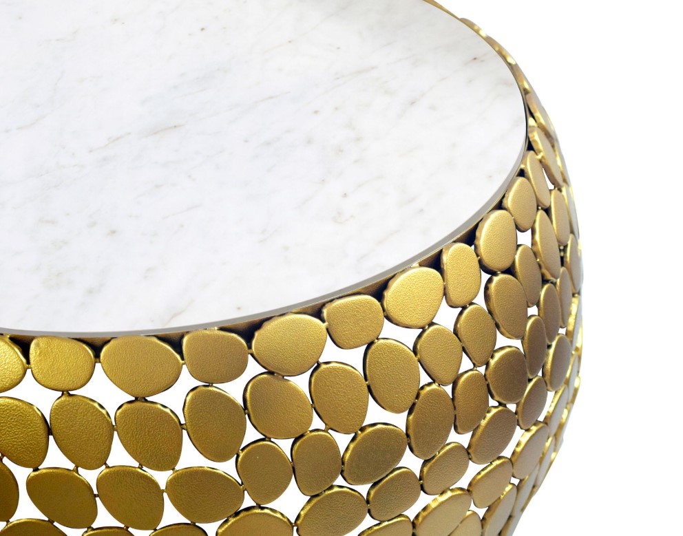 Ronde eytecatcher salontafel van metaal gecombineerd met wit tafelblad van écht marmer.