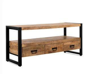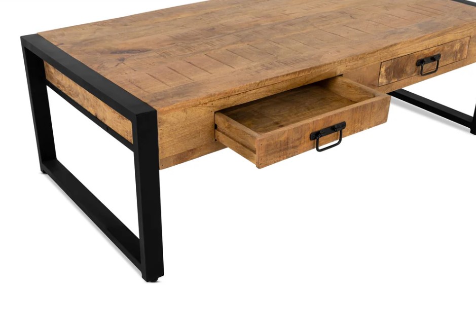 Rechthoekige industriële salontafel met laden en gecombineerd met metalen frames.