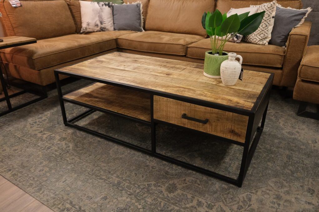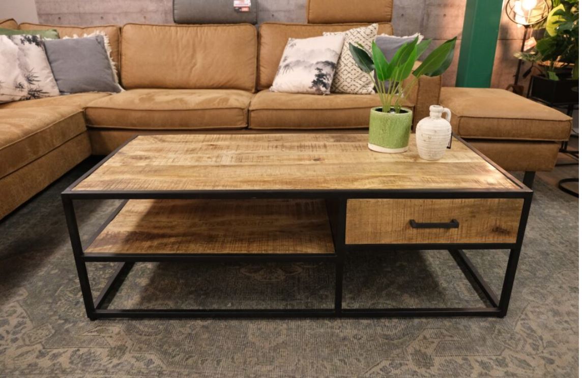 De salontafel mango 130 cm is een salontafel van mangohout met industrieël karakter. Deze salontafel is voorzien van extra opbergplateau en één lade.