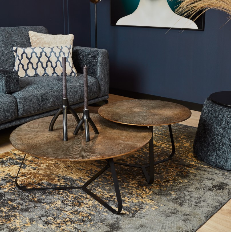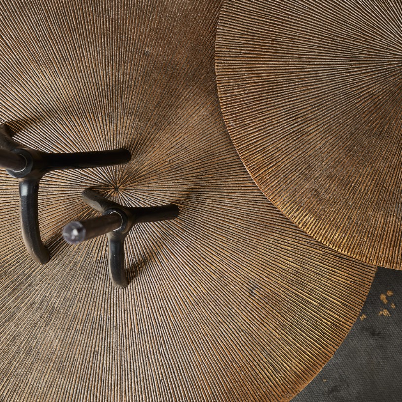 Moderne salontafel set gemaakt van aluminium en ijzer. De ronde tafelbladen zijn gemaakt van aluminium en het onderstel van ijzer. De tafelbladen zijn afgewerkt met een antiek gouden finish. Het ijzeren onderstel is afgewerkt met een zwarte finish.