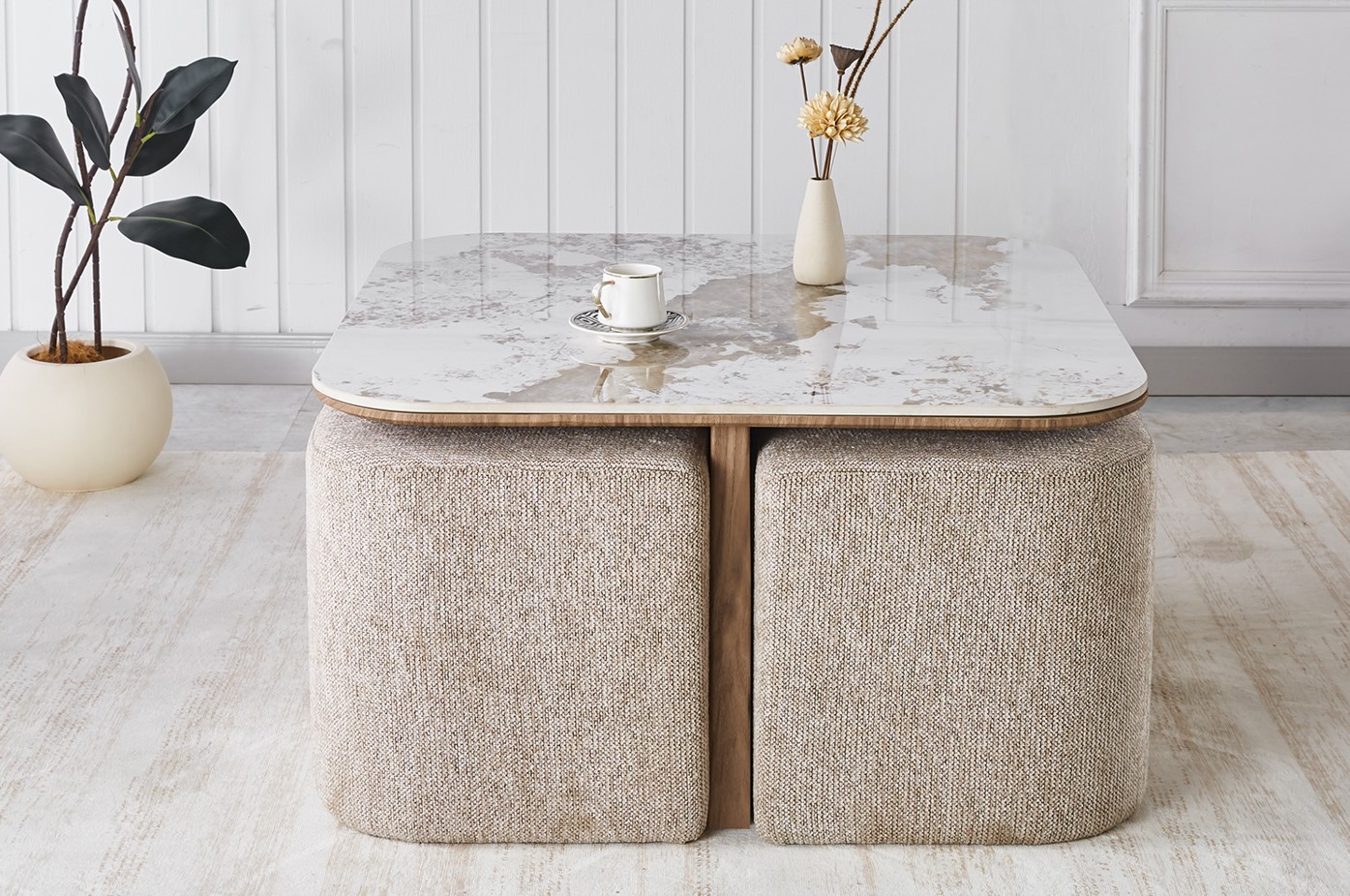 Vierkante salontafel beige keramiek 80 cm met 4 hockers