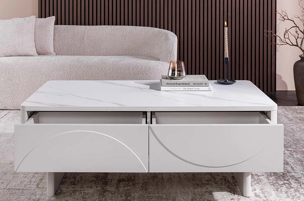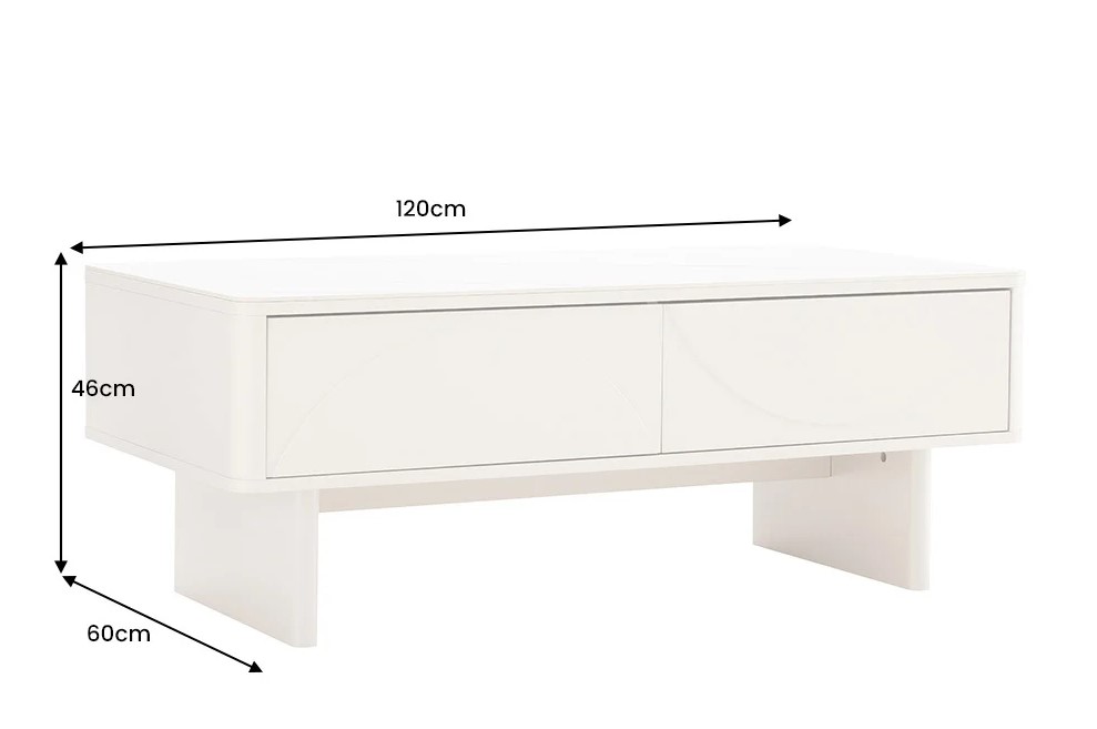 Moderne salontafel op stevige poten voorzien van twee laden en open decoratieve opbergruimte. Een echte blikvanger voor in uw woonkamer! Deze salontafel is toe te passen in verschillende woonstijlen – of het nu modern, klassiek of minimalistisch is. De vriendelijke afgeronde randen en de subtiele reliëfstructuur op de ladefronten geven de tafel een uniek karakter. Door de laden en open opbergruimte biedt deze tafel volop ruimte voor bijvoorbeeld audio & tv afstandsbediening en leuke decoraties.