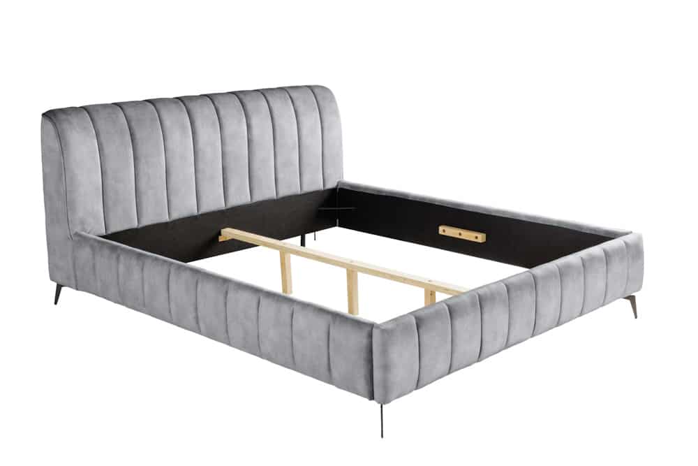 Modern en elegant tweepersoonsbed compleet voorzien van zachte fluwelen bekleding. Het bed staat stevig op metalen poten.