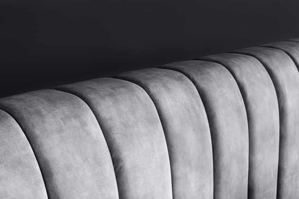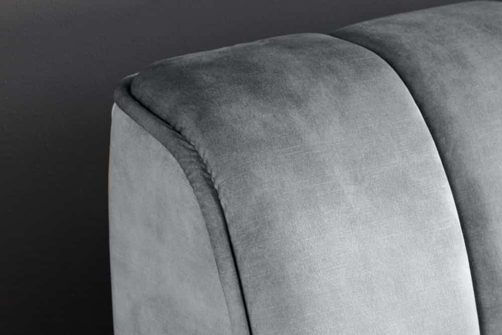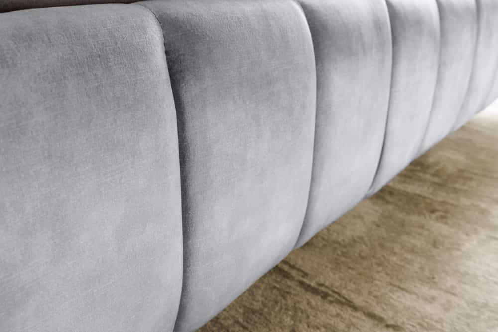 De fluwelen bekleding van dit bed heeft een lichte glans. Fluweel is een bekledingsmateriaal met unieke eigenschappen. De kleur van de bekleding kan variëren en er kunnen unieke patronen op de stof verschijnen - afhankelijk van de richting waarin de fijne stofvezels zijn gestreken en hoe de stof wordt verlicht.