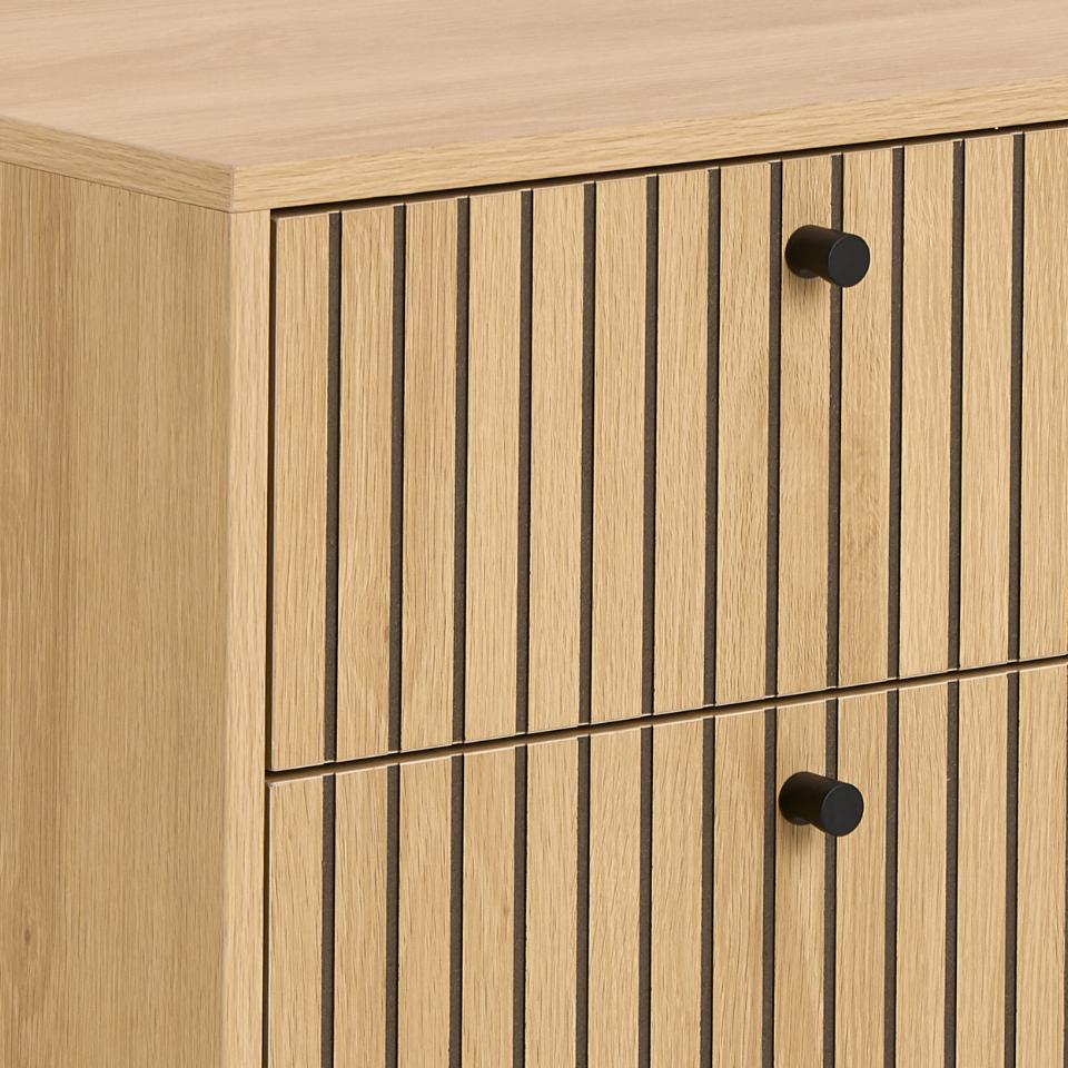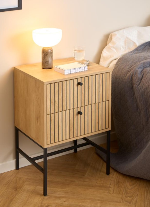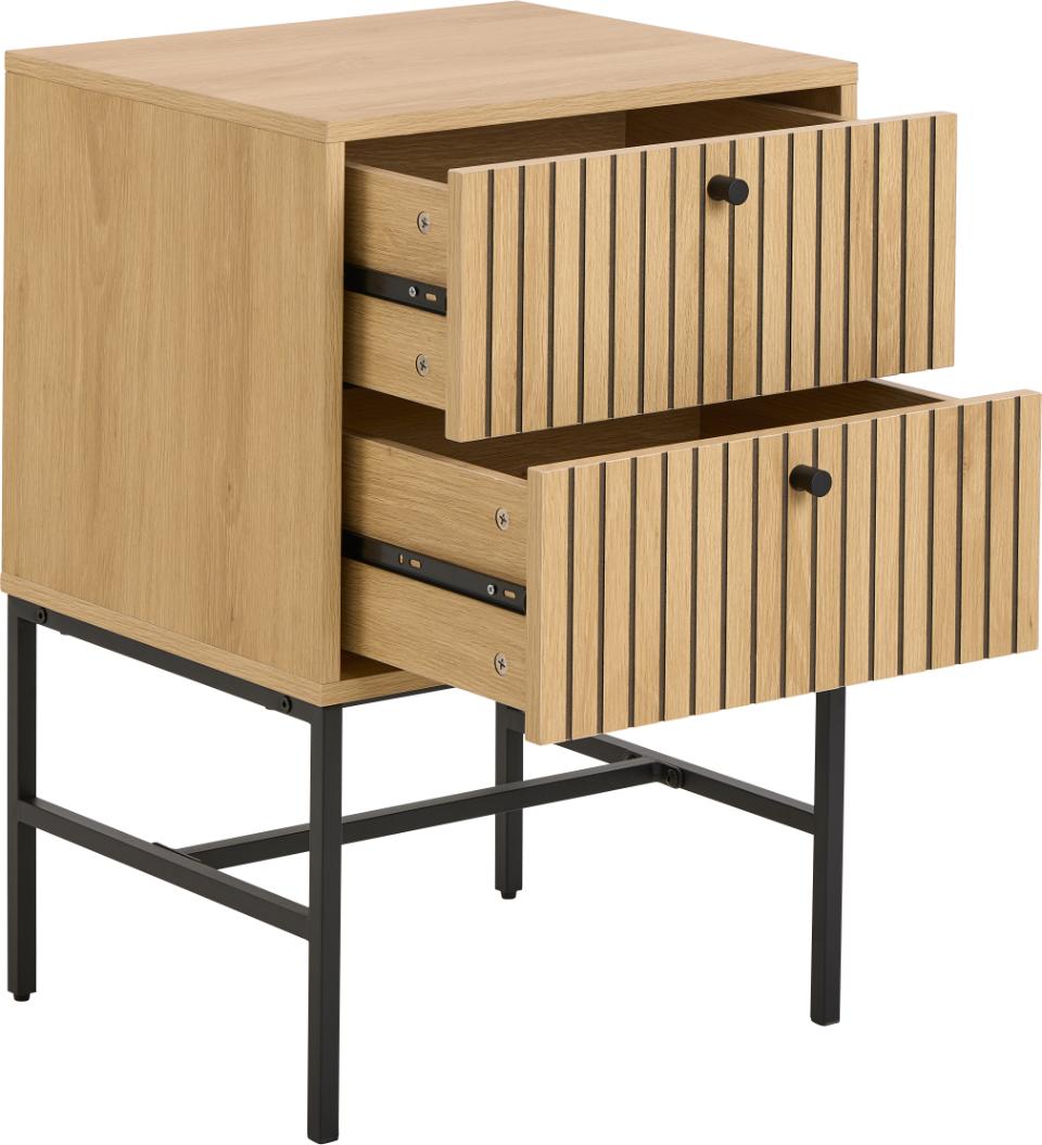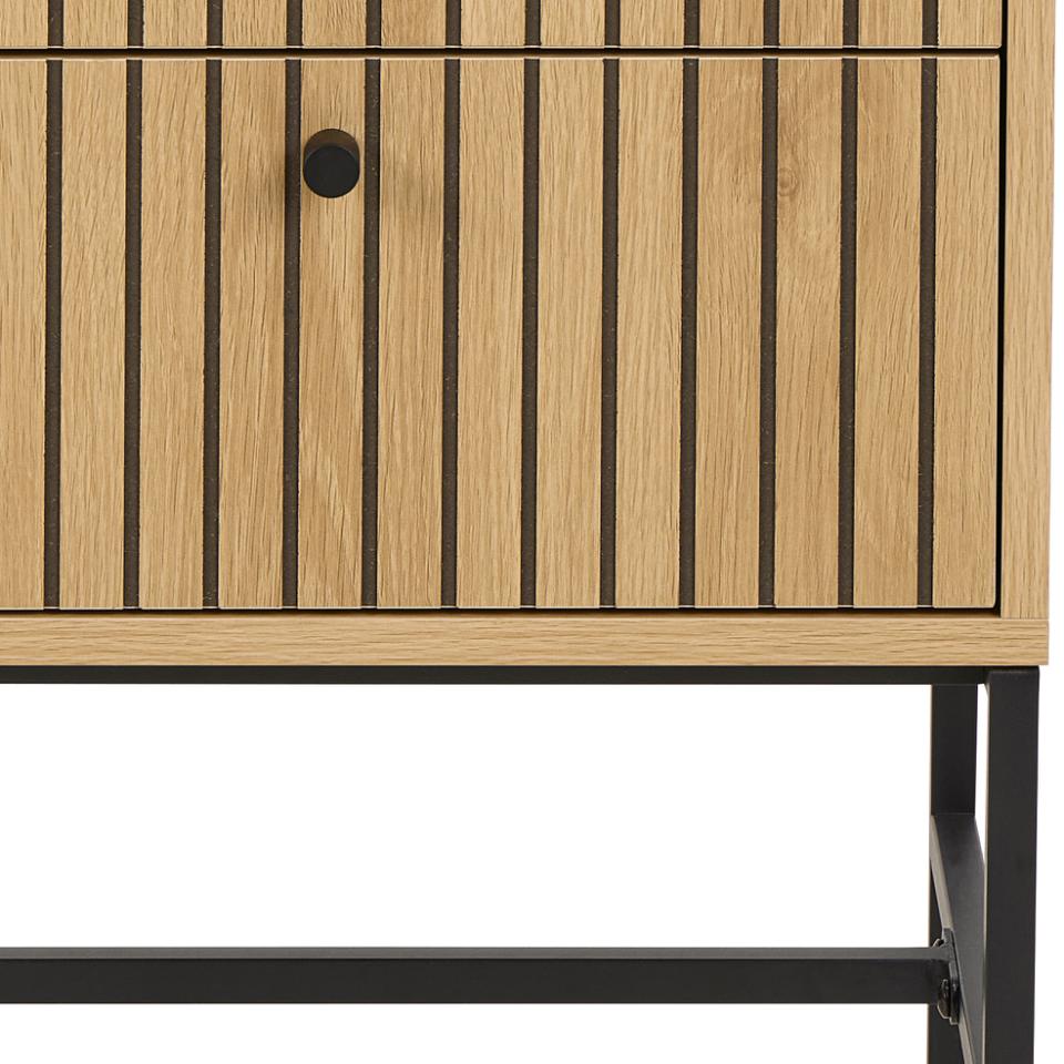Modern hoog nachtkastje in eiken kleur gecombineerd met trendy lamellen fronten en zwart metalen onderstel.