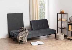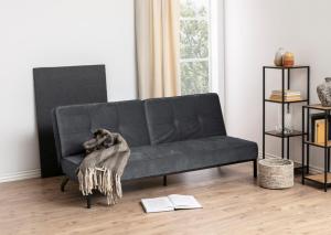 Ervaar stijl en comfort: flexibele slaapbank met praktische split-back uitklapfunctie. Bekleed met een donkergrijze stof met een tweekleurig effect en versierd met verticale stiksels, is deze slaapbank een praktische en elegante oplossing voor een multifunctionele ruimte en logeerkamer. Mocht u moe worden of overnachtende gasten ontvangen, dan kan deze bedbank dankzij het klik-klaksysteem gemakkelijk worden omgetoverd tot een bed. Afmetingen LxDxH: 198 x 95 x 87 cm Bijzonderheden: Rugleuning apart in te stellen / in te klap...