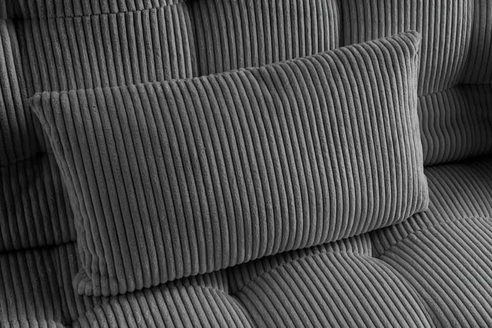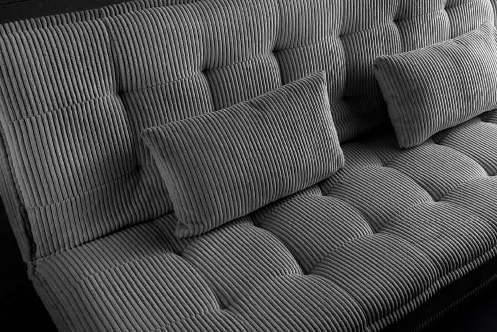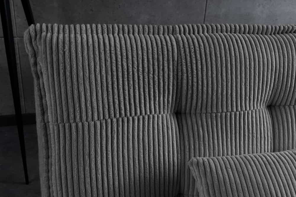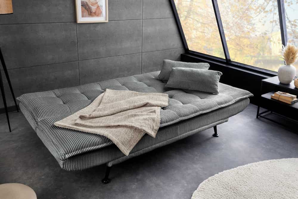 Een modern praktisch 3-zits bankstel met slaapfunctie. De bank heeft een stevige bekleding van cord stof gecombineerd met zwarte metalen pootjes.