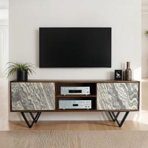 Modern multifunctioneel design lowboard met drie deuren gecombineerd met metalen onderstel. Zowel staand als hangend te plaatsen. Haal de natuurlijke flair van echte natuursteen in huis met dit prachtige tv-lowboard! Dit lowboard is verkrijgbaar in de afmeting bxdxh: 200 x 38 x 50 cm Bijzonderheden: Dit meubel kan zowel hangend als staand geplaatst worden (wordt geleverd met ophangbeugels & onderstel) Kenmerken: Greeploze deuren van acaciahout met natuursteenafwerking Scharnieren met soft close sluitsysteem Metal...