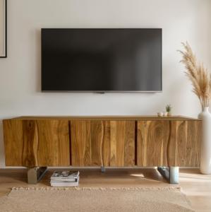 Modern TV-meubel van massief sheesham hout. Het meubel heeft twee deuren en één lade. Kenmerken: FSC Gecertificeerd, hout uit goed beheerde bossen Geschikt voor TV tot 50 inch Dit tv meubel is verkrijgbaar in de afmeting bxdxh: 135 x 45 x 51 cm Kleur: bruin Materialen: massief sheesham hout